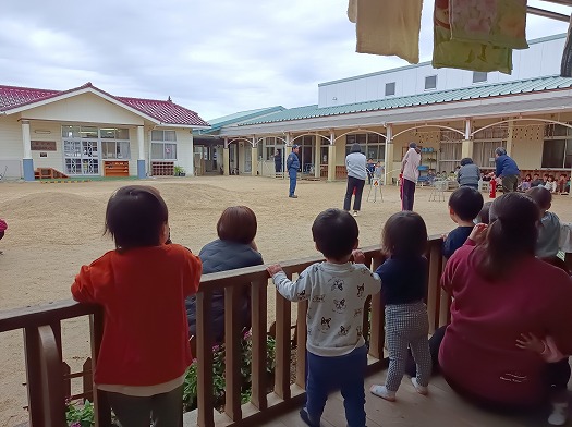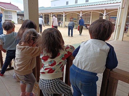 テラスで見守るゆきぐみのこどもたちは真剣な眼差しです。