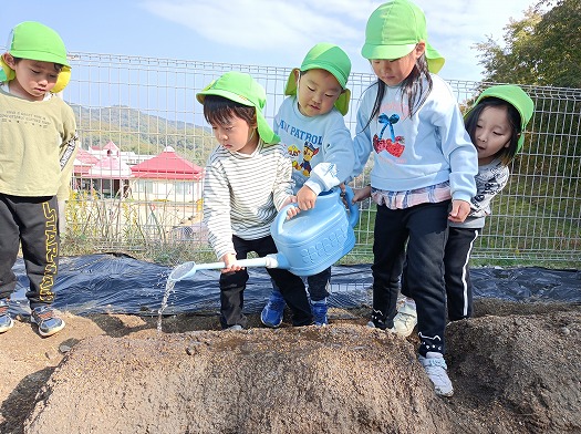 みんなが植え終わると「大きくなぁれ」と願いを込めて、お当番さんが水やりをしました。