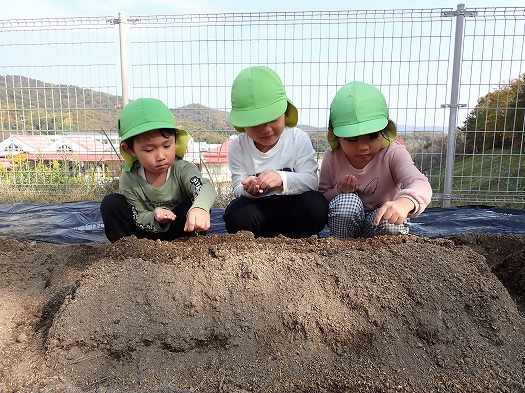 とても小さな種で、保育者から種を受け取って、植えるまでの間に落としてどこに落ちたか分からなくなってしまう事もありましたが、もう一度もらって無事に植えることができました(笑)