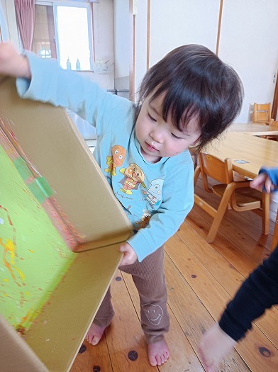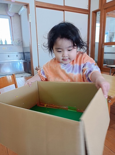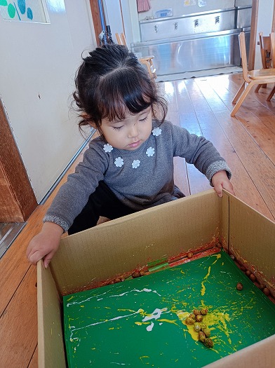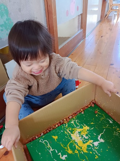 2024年12月06日 どんぐりころころ~ 1歳児 ゆき 12月の製作をしました。 ダンボールの底に画用紙を敷いて、絵の具付きのどんぐりを転がしました。 すると、コロコロコロ~ッと小気味よい音が鳴り、画用紙に色とりどりの模様が描かれて…なんだろう、とっても楽しい♪ どんぐりころころするたびに、どんどん笑顔になるこどもたちでした! ちなみに、これはクリスマスにぴったりな飾りになる予定です。 持ち帰った際には、ぜひおうちで飾ってみてくださいね♪ 一覧へ戻る
