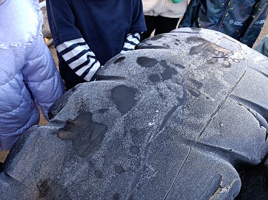 「ちょっと!大変!早く来てー!!」とこどもたちに呼ばれたので何事だろうと行ってみると、霜が降りたタイヤの遊具に手形がありました。