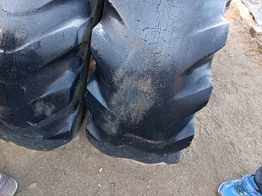 見てみるとタイヤに砂がついていました。砂かけばばあが砂をかけたのかな?