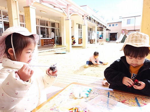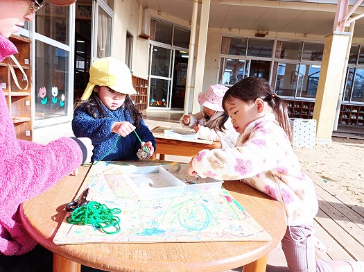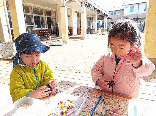 2024年12月12日 まつぼっくりツリー 2歳児 にじ まつぼっくりのお裾分けをもらったので、毛糸を巻いてクリスマスツリーに変身させました☆ 「プレゼントはプリンセスお願いしたの!」等、サンタさんの話をしながら ツリーを作っていきました。 今回は小さなビーズも使ったので、手にたくさんボンドが付いてしまいましたが、最後まで集中して取り組んでいました。 くるくるまいて~ ぺたぺたつけて ゆびさきをつかって~ かわいいツリーができたので、サンタさんが見てくれるといいね! 一覧へ戻る