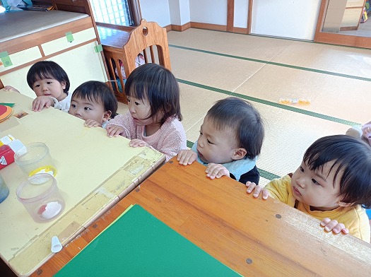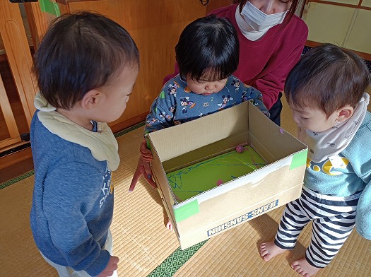 2024年12月13日 ころころ転がる 0歳児 はな 製作の準備をしていると「何してるのかな?」と気になるご様子。 一生懸命足を延ばして、棚の上を見ている姿が、とてもかわいかったです。 製作では、絵の具で色を付けたビー玉を、ダンボールに入れて転がしました。 コロコロと転がる様子が、面白かったようです。 何ができるかはお楽しみに♪ 一覧へ戻る