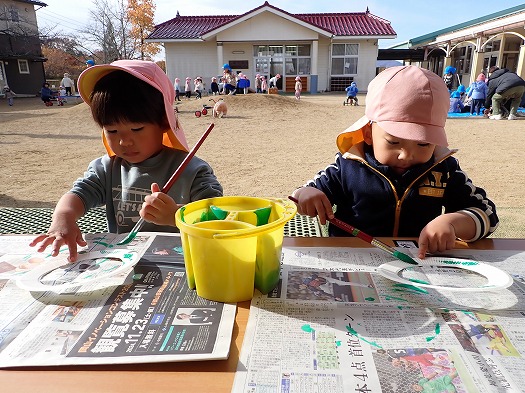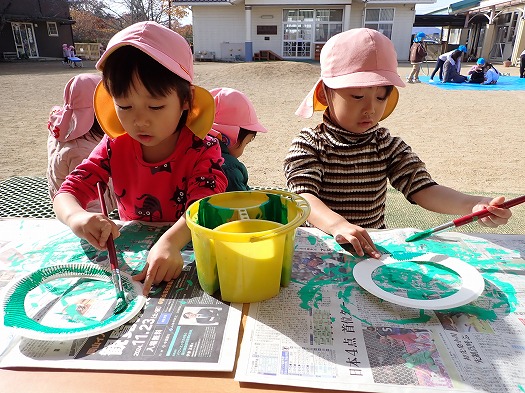 2024年12月16日 絵の具 3歳児 つき クリスマスのリースを作るために、紙皿を緑の絵の具で塗りました。 初めての筆に「どうやってもつん?」「こう?」など、持ち方・塗り方を気にしながら、真剣な表情で塗っていました。 友だちの様子を見て「○○はまだ?」と自分の順番が来るのを楽しみに待っている姿もありました。 リースが完成するのが楽しみだね! 一覧へ戻る
