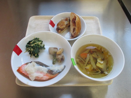 2024年12月20日 給食室(12月18日の給食、おやつ) 給食室 昼食 ・ごはん ・鮭のとろろ焼き ・いかと里芋の煮物 ・ほうれん草のおひたし ・沢煮椀 おやつ ・豆パン ・牛乳 『鮭のとろろ焼き』は、新メニューでした。 鮭をかるく焼いて、 長芋をすりおろした物と、マヨネーズ、薄口しょうゆ、酒を混ぜた物を うえにのせ焼きました。 味もしっかりして美味しかったです。 和え物の”ほうれん草”は旬の食材でした。 おやつも今日は、新メニューでした。 金時豆が入った『豆パン』でした。 一覧へ戻る