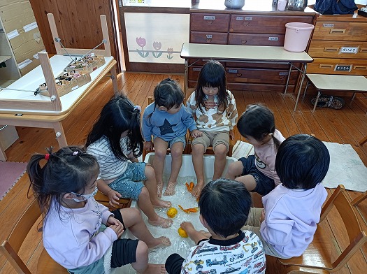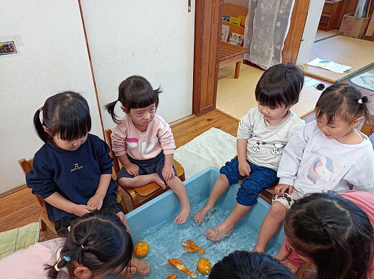2024年12月20日 いい香りでぽっかぽか 2歳児 にじ 12月21日は冬至です。 少し早いですが、ゆず湯をクラスでしてみました。 冬至の説明をした後で、一人ずつ持って クンクンと匂いをかいだりもしてみました。 いい匂いに待ちきれないこども達。 いざ!足湯のスタート! 「気持ちがいいね」と言いながらのんびりとした時間を過ごしました。 来年も元気いっぱいで過ごせますように☆ 一覧へ戻る
