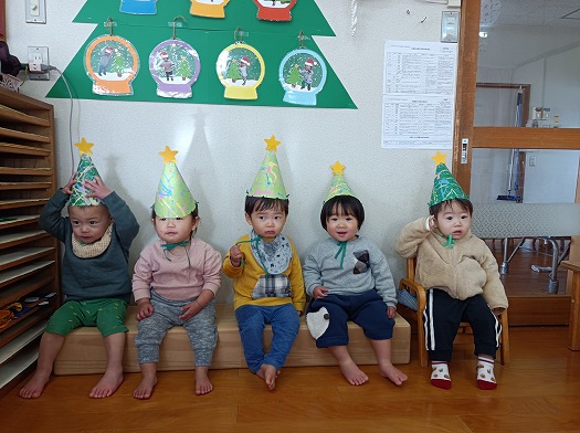 手作りのツリー帽子をかぶってサンタさんに「幸せなら手をたたこう」を披露したのですが、緊張からか固まってしまう子がほとんどでした(笑)