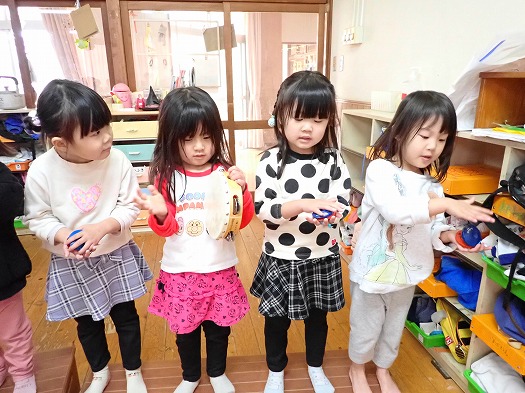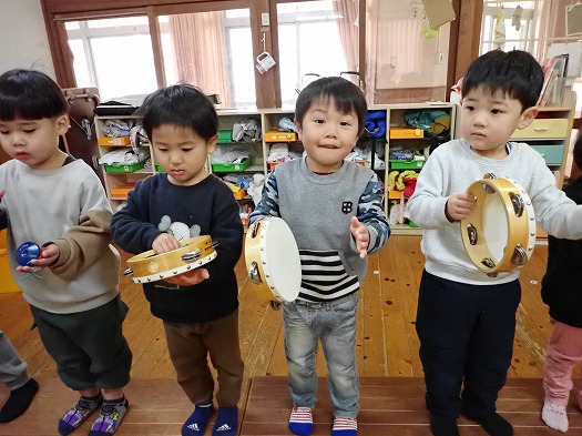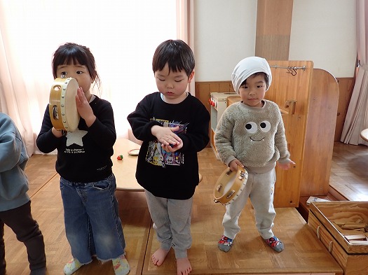 2024年12月24日 楽器 3歳児 つき タンバリン、カスタネットを触ってみました。 つき組になって初めて楽器に触れたのですが、音楽をかけると身体を横に揺らしながら自由に音を出していました。 台を並べるとその上にみんなで並び、つき組音楽隊が結成されました。 一覧へ戻る