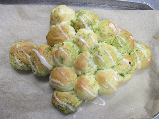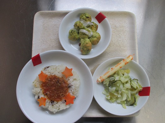 2024年12月26日 今日の給食 給食室 12月24日(火) 12月の誕生会、クリスマス会がありました! 《献立》 ・リースドライカレー・・・レーズンとパセリが入ったご飯をリース型にして、真ん中の空いたところにドライカレーを入れて食べました。モリモリとよく食べていました。 ・ハワイアンサラダ ・チーズ・・・久々に出ました。喜んで食べる子が多かったです。 (おやつ) ・ツリーパン・・・抹茶とドライフルーツが中に混ぜ込んであり、アイシングでツリーの飾りを表しています。 ちぎりパンのようにして提供しました。 12月が誕生日の皆さん、おめでとうございます! 一覧へ戻る