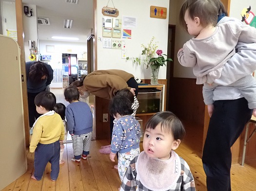 保育者の「あけましておめでとうございます。」の言葉を聞くとペコっと頭をさげて一緒に挨拶をしていました。