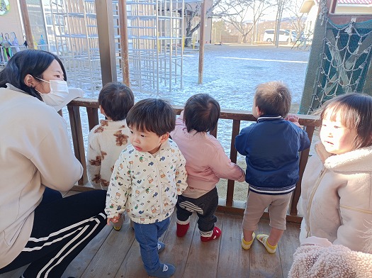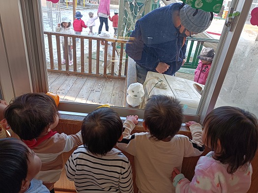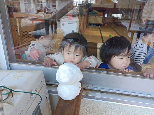 職員が作ってくれた雪だるまに興味津々なこどもたち。