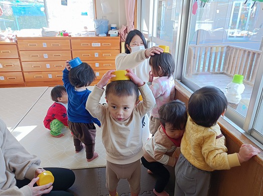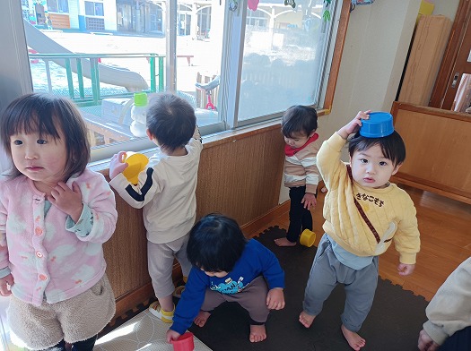 雪だるまに帽子代わりの玩具を被せるとAちゃんが同じものを持ってきて自分の頭に乗せていると他の子たちも真似をして玩具を乗せていました♪