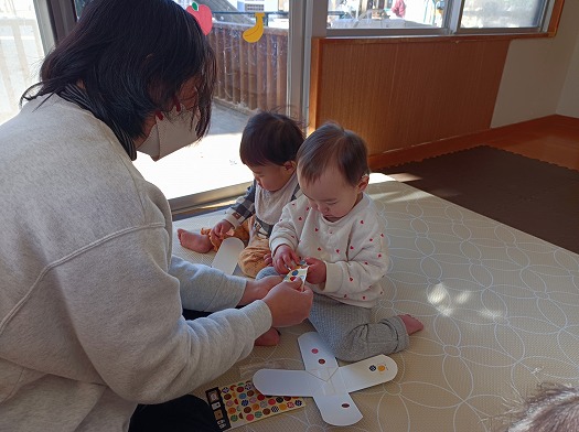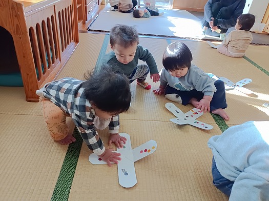 2025年01月10日 クルクル~♪ 0歳児 はな 牛乳パックにペタペタとシール貼りを楽しんでからくるくる回してコマ回しをしました! 職員がお手本でクルクル回してみるとこどもたちも見様見真似で回す姿に成長を感じました♪ 一覧へ戻る