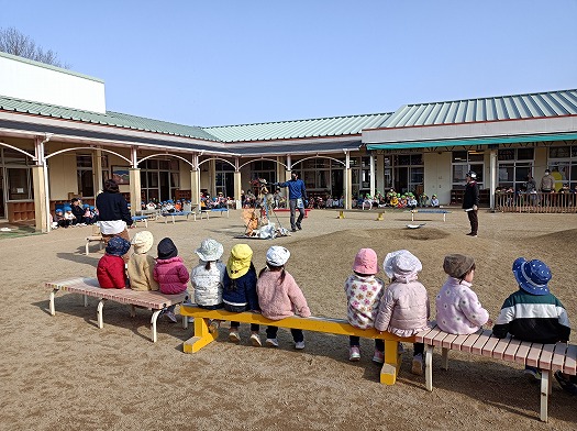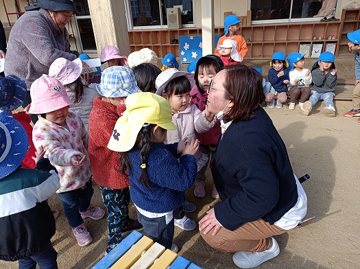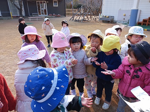 2025年01月14日 とんど焼き 2歳児 にじ 誕生会の後、みんなで園庭に出て、とんど焼きに参加しました。 まだかな~ とんど焼きの由縁の話を聞き、いざスタートです。 保育者の真似をして一生懸命お願い事をしていたのですが… 「プリンセスになれますように」「たくさん食べれますように」と、可愛いお願いがたくさん聞こえてきて、ほっこりしました。 無事燃えた後は、お楽しみの顔に炭をつけます☆ 自分でほっぺに塗ったり、友だちや保育者と塗り合ったり。 今年も1年無病息災で過ごせますように。。。 元気で頑張るぞ~! 一覧へ戻る