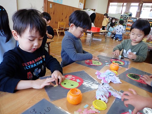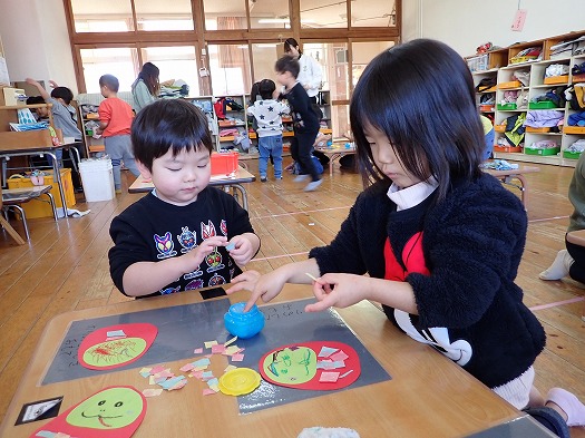 クレヨンでヘビの顔を描いたり、折り紙をのりで貼ったりと、集中して製作していました。