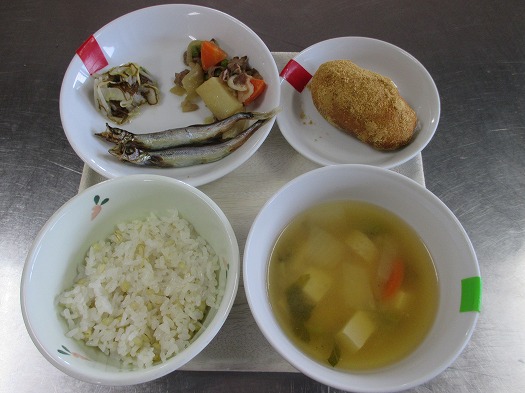 2025年01月28日 給食室(1月24日の給食、おやつ) 給食室 昼食 ・もち麦ごはん ・ししゃもの素焼き ・肉じゃが ・もずくの酢の物 ・豆腐のみそ汁 おやつ ・きな粉揚げパン ・牛乳 『ししゃもの素焼き』はかみかみメニューでした。 しっかり嚙みちぎって食べれていたようです。 おやつは新メニューで、『きな粉揚げパン』でした。 生地から手作りで、 1度焼いてから、油で揚げて、きな粉をまぶしています。 手間はかかるのですが美味しくできたと思います。 こどもたちもたくさん食べていました。 一覧へ戻る