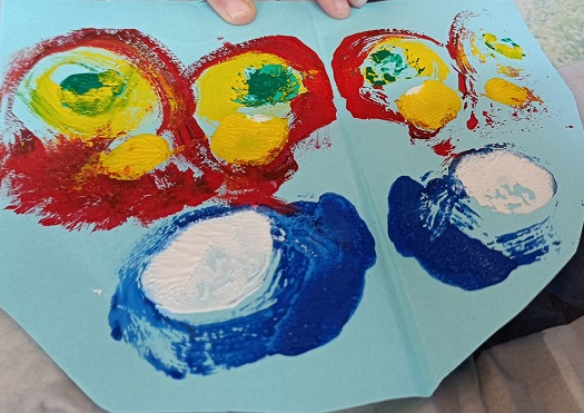 デカルコマニーという技法を使って画用紙の半分に絵の具をつけて折って開くときれいな模様になりました。