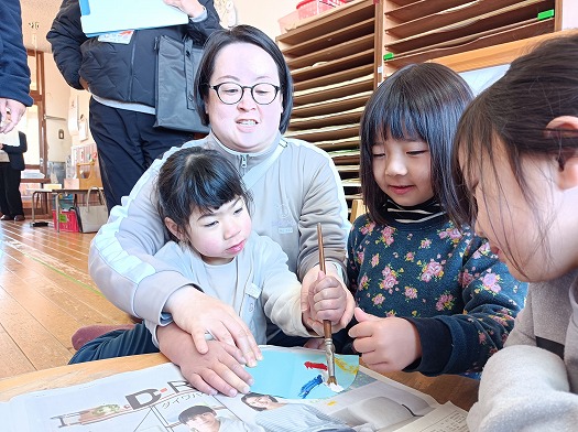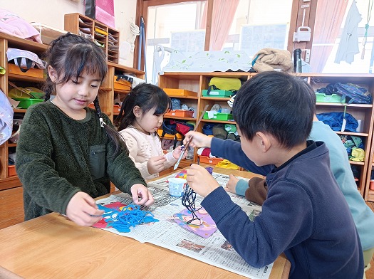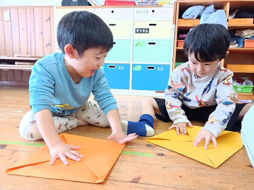 鬼と戦うには豆も必要!豆を入れる物も必要ということで枡も自分たちで折りました。大きな色画紙での折り紙で「わぁ~おおきい!」と子どもたちはとても大喜びでした。