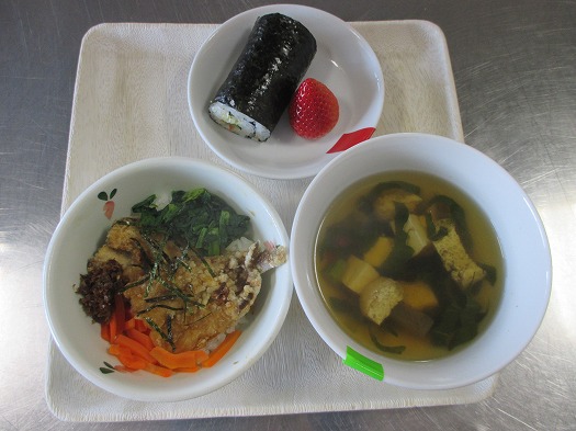 ・恵方巻・・・甘辛く炊いた鶏ミンチ、マヨネーズで味付けしたキャベツ、人参、きゅうりを巻いています。恵方を向いて黙って食べるクラスもありました。どんな願い事をしたのかな?