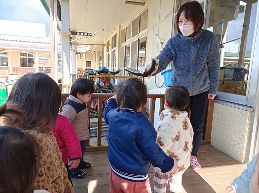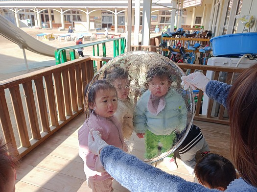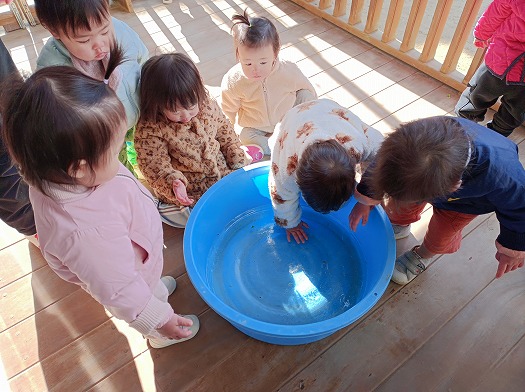 2025年02月05日 どう見える? 0歳児 はな 水を張ったタライを保育室の裏手に置き、大きな氷を作りました! 大きなタライの氷も興味津々で覗いてくるこどもたち。 「ながーい!」と指差しながら言うAちゃん タイヤの溝にあった氷も一緒に持ってきて見せると「ながーい!」との一言! 少しずつ大きくなっているなぁと思った瞬間でした♪ 一覧へ戻る