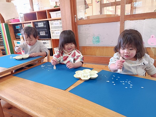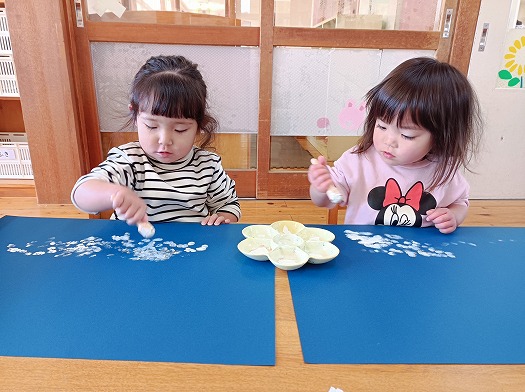 2025年02月10日 ゆーきやこんこん♪ 1歳児 ゆき 今年一番の寒さが到来し、時折雪が舞うこの頃。 ゆきぐみでは、白い絵の具のスタンプ雪が降りました。 ポンポンと押して丸いボタン雪を描く子や、スタンプで曲線を描き吹雪を起こす子など、描き方は様々です。 でも、みんな共通していることは、とても楽しんでいるということ。 スタンプしていると自分の手も白くなり、その手を見た子が楽しそうに、自分の手にスタンプすることも(笑) こどもたちが楽しいと、保育者も楽しくなります♪ さて、どのような製作になるのか、楽しみにしていてくださいね♪ 一覧へ戻る