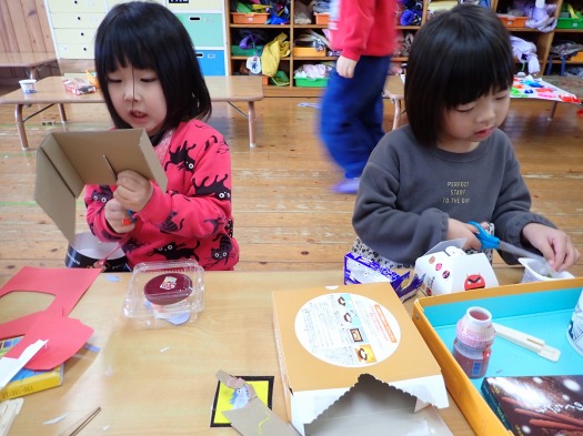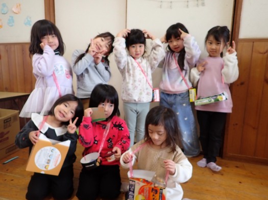2025年02月20日 かわいいでしょ? 4歳児 ほし 廃材を使って製作をするのが最近のブーム! 始めは色々な形を切ることを楽しんでいましたが、一人がカバンを作ると「それかわいいー!」「それ作りたい~」「ひもつけてー!」と女の子たちの間でカバン作りが流行りました。 みんなで出来上がったかばんをさげ、ルンルンでお出かけしていました。 「写真撮るよ~」と声をかけると可愛いポーズもバッチリでした♪ 一覧へ戻る