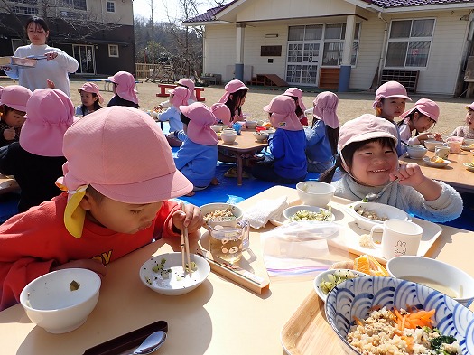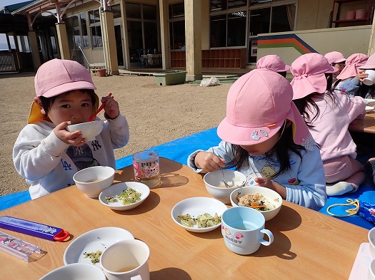 ご飯の準備もいつもより早く、食べ始めると「あったかいなぁ」「たのしいね」などと、友だちと会話をしながら食べていました。