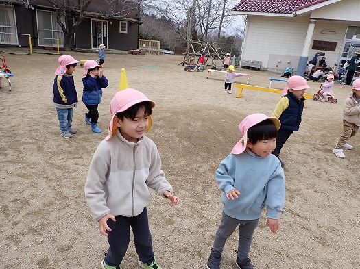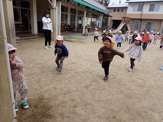 2025年03月26日 だーるまさんがこーろんだ! 3歳児 つき だるまさんが転んだをしました。 一回目は保育者が鬼の役をしたのですが、2回目は「鬼やりたい」とこどもたちが鬼の役もしました。 「だーるまさんがこーろんだ」の声に合わせて走って進みます。勢いをつけて走る子、しっかり止まれるように慎重に進む子、それぞれ個性が出ていました。 好きなあそびの時間にも友だちを誘って楽しんでいます。 一覧へ戻る