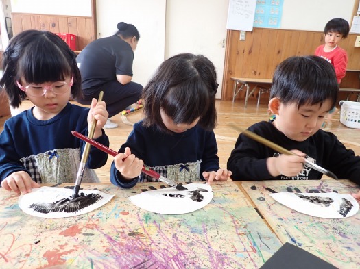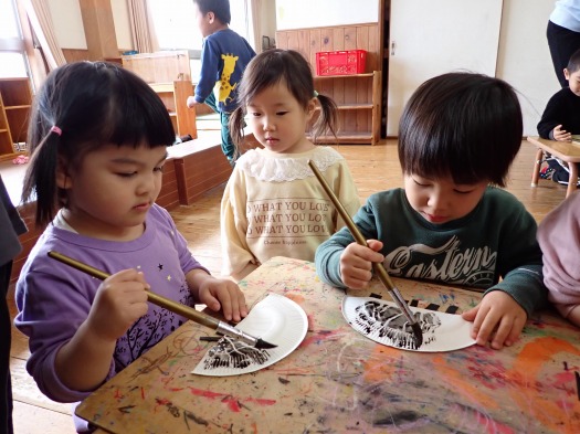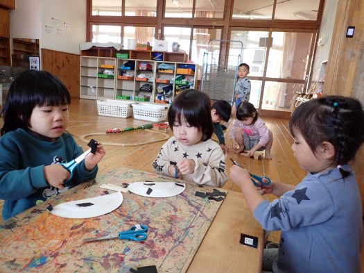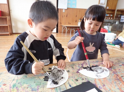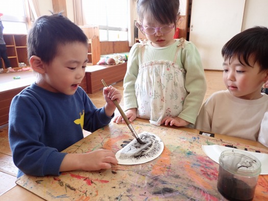 2025年04月08日 ダンゴムシ 3歳児 つき ダンゴムシが大好きなこどもたち。 ダンゴムシの製作をはじき絵で行いました。 白クレヨンで線を引いた上に黒の絵の具を塗ると、あら不思議。絵の具がはじくんです。 ハサミもチャレンジしてみました。 壁面にはっているのでまた見てみてくださいね。 一覧へ戻る
