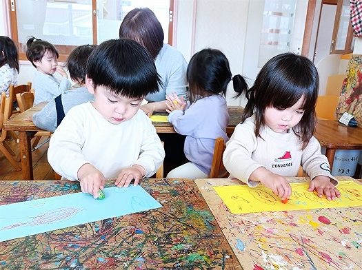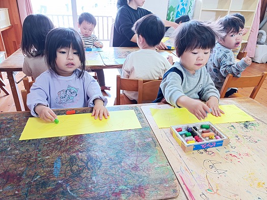 何回もクレヨンの色を変えたり、画用紙いっぱいに絵を描いたりしていました。