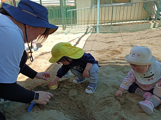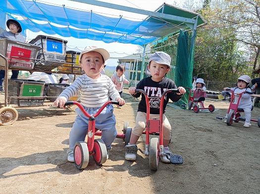 砂場で砂の感触を味わったり、三輪車に乗ったりして、好きなあそびを存分に楽しむこどもたちです。