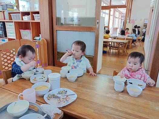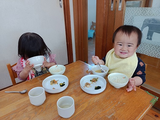まだまだこぼすこともありますが、自分で食べたい!の気持ちを大切にしながら食事を進めます。