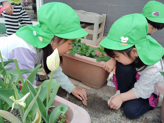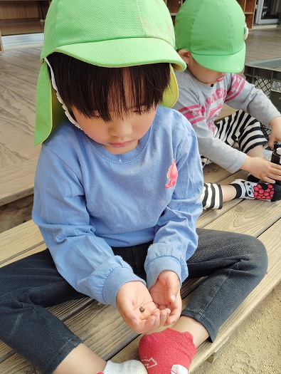 2025年04月22日 大流行中! 4歳児 ほし 春になって暖かくなり虫たちも起きてきた今日この頃…。 ただいまほし組では、虫探しが大流行中! 花壇の隅っこ、プランターの下などいろいろなところを探しています。 どこかな? ダンゴムシみーつけた! 一覧へ戻る