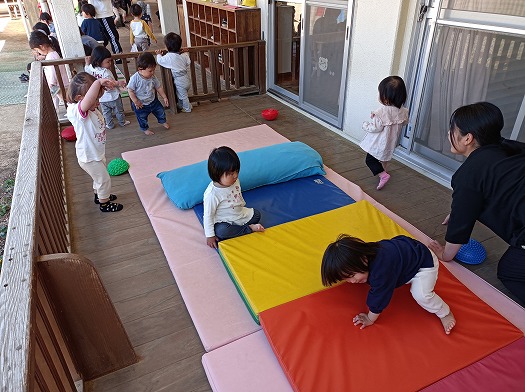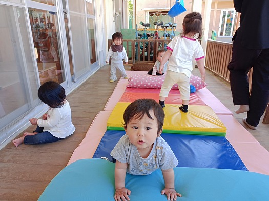 2025年04月25日 テラスって楽しいね♪ 0歳児 はな 1歳児 ゆき テラスにマットとクッションを並べて、はなゆきさん用のアスレチックを作りました。 マットが敷かれると、即座にハイハイやジャンプを始めるこどもたち。 身体を動かすことを心から楽しむ姿があります。 小さな段差や緩やかな斜面も、こどもにとってはバランスを取るのは難しいですが、何度も乗り越えながら、身体の使い方を学んでいます。 これからも身体を動かすことが楽しい、心地いいと感じられるようにサーキットやリズム等いろいろなあそびをします。 一覧へ戻る