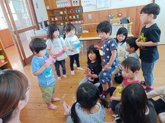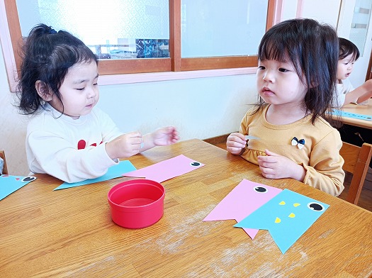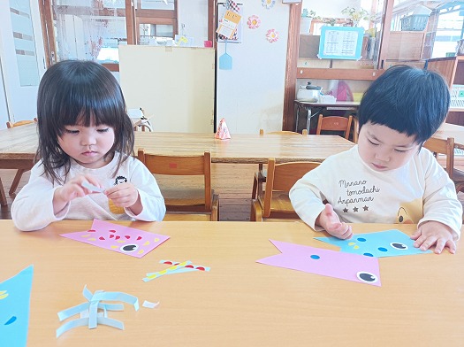 2025年05月02日 こいのぼり作ったよ 2歳児 にじ 先日こいのぼりを作りました。 大きいシールと小さいシール、好きな方を選んで貼りました。 小さいシールも指先を使って上手に貼ることが出来ます。 出来たこいのぼりを持ってお出かけしました。 他のクラスの友だちにも見てもらい、大満足のにじぐみです。 一覧へ戻る
