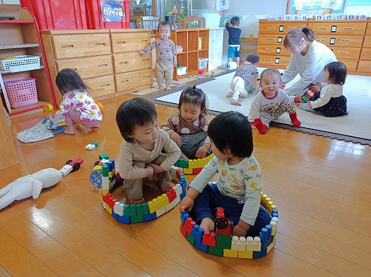 2025年05月09日 すきなあの中からあそびから 1歳児 ゆき お気に入りの遊び一つがBブロックです。 長く繋げタイヤをつけて、自分だけの車を作ったり、保育者の作った輪っかをおうちに見立てて入ったりしています。 一人がおうちに入ると、わたしも!ぼくも!と入りたい子が次々と作って欲しいことを伝えてきます。 おうちを作ると、思い思いに入り、友だちと並んでにっこり微笑んだり隣同士ではなしをしたりと微笑ましい姿が見られます。 一覧へ戻る