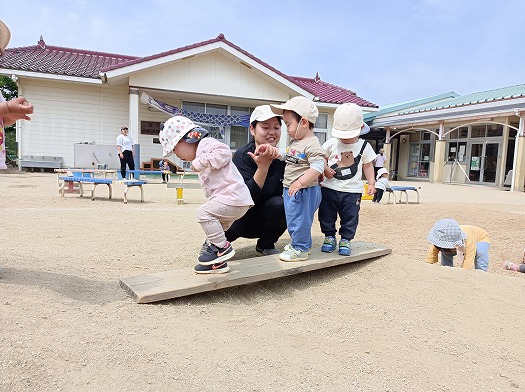 2025年05月16日 いっぽんばし 1歳児 ゆき 園庭の山と山の間に一本橋を用意すると、周りをよく見ているこどもたちは保育者が声を掛けるよりも早く、集まってきます。 両足が乗る幅の広い板ですが、こどもにとってはバランスを取るのが難しいようです。 ゆっくりと、慎重に…保育者の手も借りながら、渡りきれると得意そうに笑ってどこか誇らしげな表情を覗かせます。 あそびを楽しみながら、身体の使い方を覚え、様々なあそびに挑戦したいです。 一覧へ戻る
