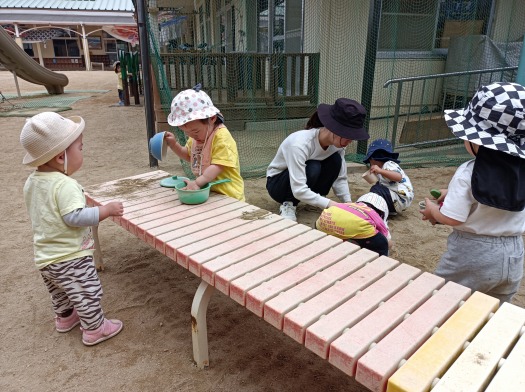 砂場では、皿や鍋に砂を入れて、友だちや保育者に「どうぞ」と振る舞う姿が見られるようになってきました。