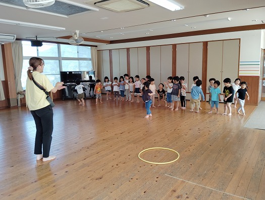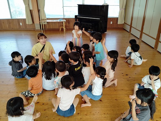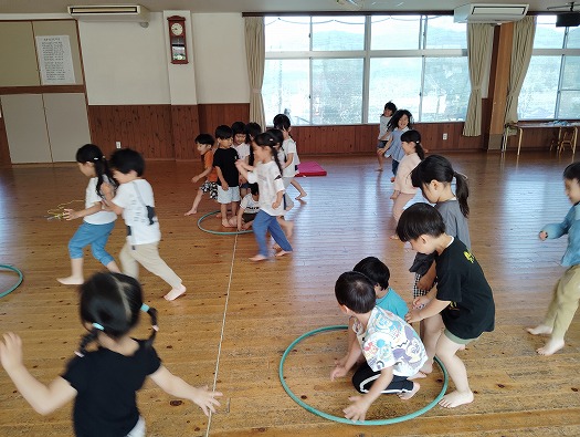 2025年05月23日 おーちたおちた 4歳児 ほし 保育者「おーちたおちた」 こども「なーにがおちた」 保育者「メロン!」 メロンへ走れー! 捕まえたぞ! 「おーちたおちた」知っているひとー?と聞くと「はーい!」と手を挙げる子がが多く、改めて保育者とルールを確認しながら遊びました。 「またしたい!」という声がたくさんあったので、次回はちがうものを落としてやりたいと思います。 次は何を落とす? 一覧へ戻る
