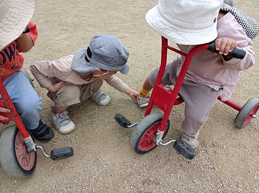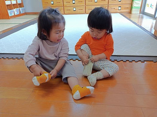 2025年06月04日 生活の中から 1歳児 ゆき 「外へ行こう」と伝えると、靴下を用意して準備を始めるこどもたち。 中には、自分で靴下を履いてみようとする子もいます。 自分でやってみようとする姿が芽生えてきました 今はまだ保育者の手を借りながらですが、何度も履くうちに 1人で靴下を履ける日も遠くないですね。 その日の戸外あそび中… 靴が脱げた友だちがいました。 すると、それに気づいた子が靴を拾って、履かせ始めました。 友だちを思う気持ちの優しさに嬉しさと成長を感じました。 「はい、どうぞ」 一覧へ戻る