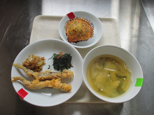 2025年06月21日 給食室(6月18日の給食、おやつ) 給食室 昼食 ・ごはん ・ししゃもの天ぷら ・切り干し大根の焼きそば風 ・青菜の磯和え ・しそのみそ汁 おやつ ・米粉黒ごまマフィン ・牛乳 今日はししゃもに衣をつけて揚げた『ししゃもの天ぷら』が かみかみメニューでした。 いつもと違う食感、楽しめたかな? みそ汁には旬の食材”しそ”が入っていました。 いい香りのみそ汁でした。 一覧へ戻る