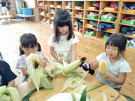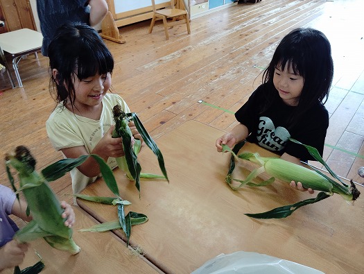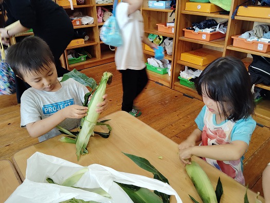 2025年06月20日 とうもろこし🌽 4歳児 ほし 「これなーんだ?」 「とうもろこし!」 「ほんとに?じゃあ、むいてみよう!」 「あれ?全然とうもろこし出てこない…」 「とうもろこしじゃないかも…」 「出てきた!やっぱりとうもろこしだった!」 こんなやりとりをしながら、とうもろこしの皮むきを楽しみました🌽 一覧へ戻る