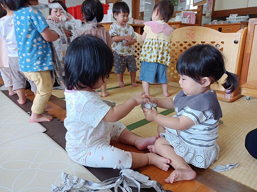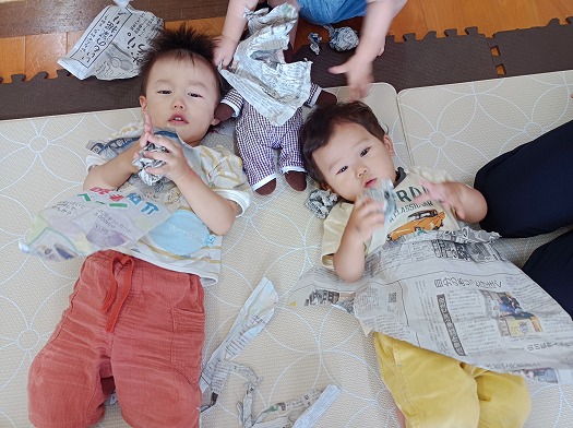 2025年06月30日 雨の日はやっぱり… 0歳児 はな 1歳児 ゆき あいにくの雨の日も、新聞紙があれば退屈なんて吹っ飛びます。 ジャジャーン!と新聞紙を見せると、わくわくした瞳を見せるこどもたち。 新聞紙で作った洋服を着たり、布団にして寝転んだり、遊び方は様々。 新聞紙の感触を友だちと仲良く共有。 新聞紙あそびを始め、「外に出られない雨の日も、室内で楽しみがある保育園」として、わくわくしながらこどもたちが登園できるようにします。 一覧へ戻る