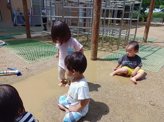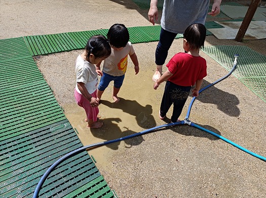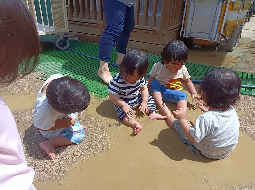 水やどろんこに、最初は抵抗感を持つ子もいましたが、だんだんと遊ぶうちに自ら触ったり、水の中に座ったりしていました。
