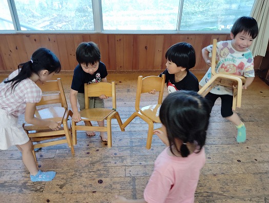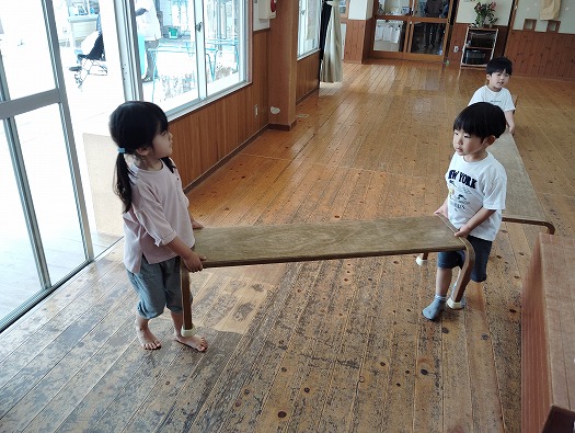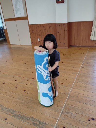 誕生会終わり、いつもは椅子やござなどはそら組が片付けます、しかし、この日はプールに行かないといけない!ということで、そら組からほし組に片づけを任されました!