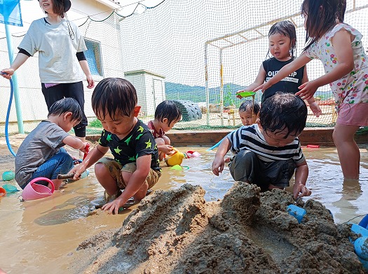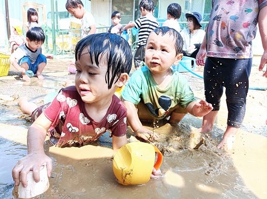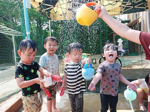 始めは少し水をさわってみたり、カップに入れて楽しんだりしていたこどもたちでしたが、だんだんとあそびがダイナミックになり…