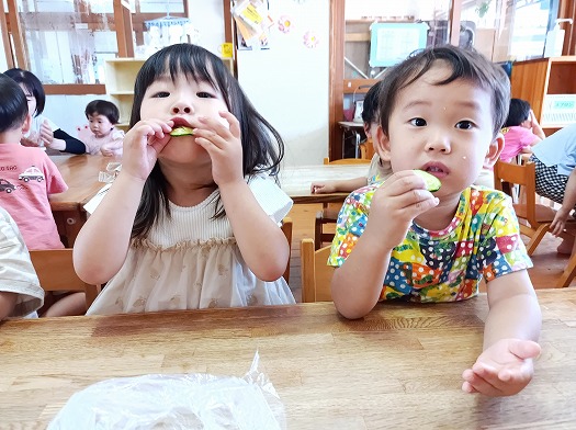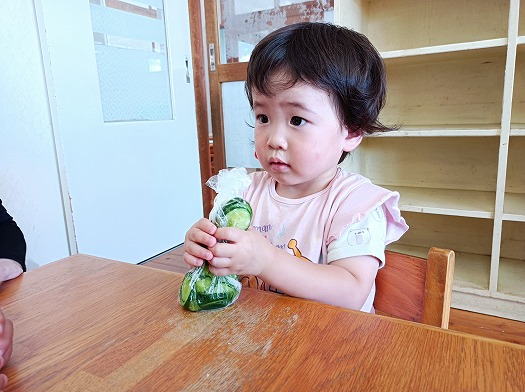 2025年06月30日 もみもみ 2歳児 にじ 輪切りに切ったきゅうりをもんでみました。 職員がきゅうりの入った袋を持って「こうするんだよ」ともみもみしてみると、やる気満々なこどもたち。 真剣な顔でもんでいる子、優しい力でもんでいる子などさまざまでした。 中には、握るように力を込めている子もおり、きゅうりの水がたくさん出ていて笑ってしまいました! 最後はみんなできゅうりを食べました。 美味しかったね! 一覧へ戻る