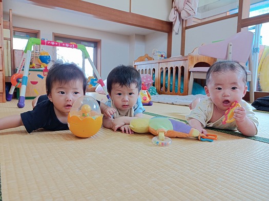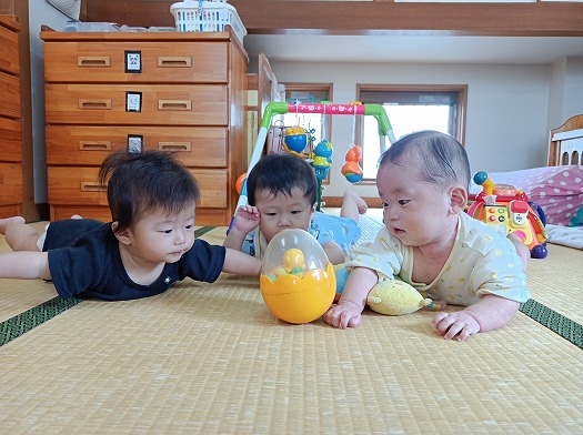 自分の前にある玩具に手を伸ばしたり、友だちの使っている玩具の方がいいなと思ったらそっちの方へ方向を変え、触る姿が見られてとてもほっこりしました。