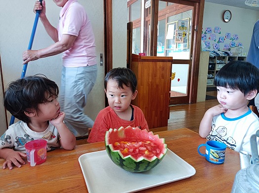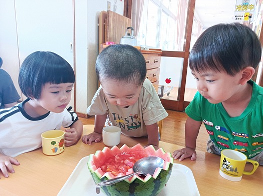 2025年07月05日 スイカの中に 2歳児 にじ 7月4日のおやつはスイカポンチでした。 半分に切られたスイカの中にはスイカのほかにみかんや白玉などたくさんの果物が入っていました。 中に何が入っているのか気になっている姿が可愛らしかったです。 また、「スイカの匂いがする」と鼻をクンクンしている子もいました。 おかわりもたくさんして、あっという間になくなってしまいました。 とても夏を感じたね! 一覧へ戻る
